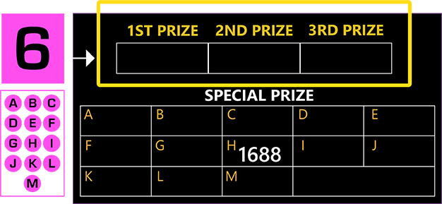 After all 23 combination of 4D numbers has completed, then the second step is to decide which three (3) Special prizes position will be selecting for the top 3 prizes. The last machine has total 13 balls (from A to M), and we will now drawing 3 balls in sequence, while the first ball is Third Prize, the second ball is Second Prize, and the last ball is the First Prize of the game.